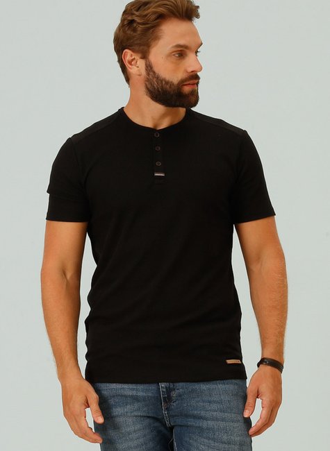 Modelagem regular fit que se adapta perfeitamente ao corpo, possui uma gola henley com peitilho e botões.